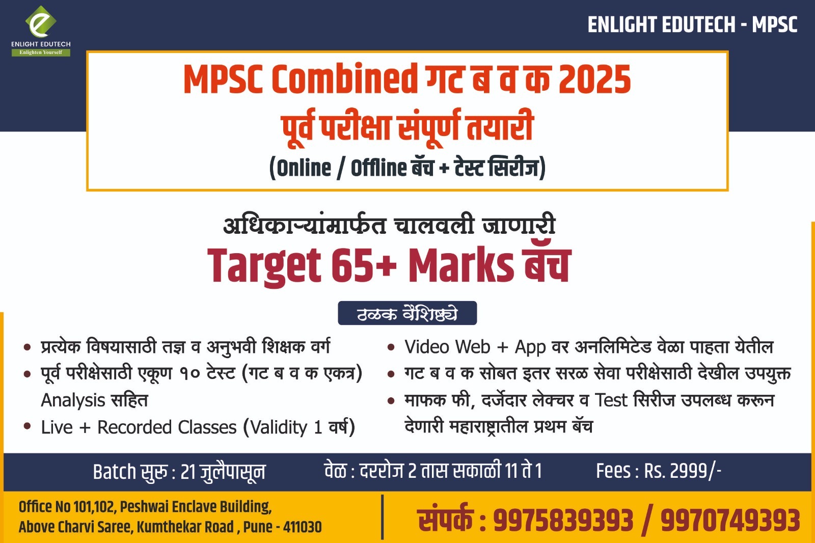 MPSC Combined 2025 संपूर्ण तयारी बॅच ही महाराष्ट्र लोकसेवा आयोगाच्या संयुक्त गट-ब (Group-B) आणि गट-क (Group-C) परीक्षांसाठी विशेष तयार करण्यात आली आहे. या बॅचचा उद्देश विद्यार्थ्यांना पूर्व परीक्षा, मुख्य परीक्षा आणि मुलाखत या सर्व टप्प्यांसाठी सखोल, अचूक आणि परीक्षा-पद्धतीला अनुकूल मार्गदर्शन करणे हा आहे.